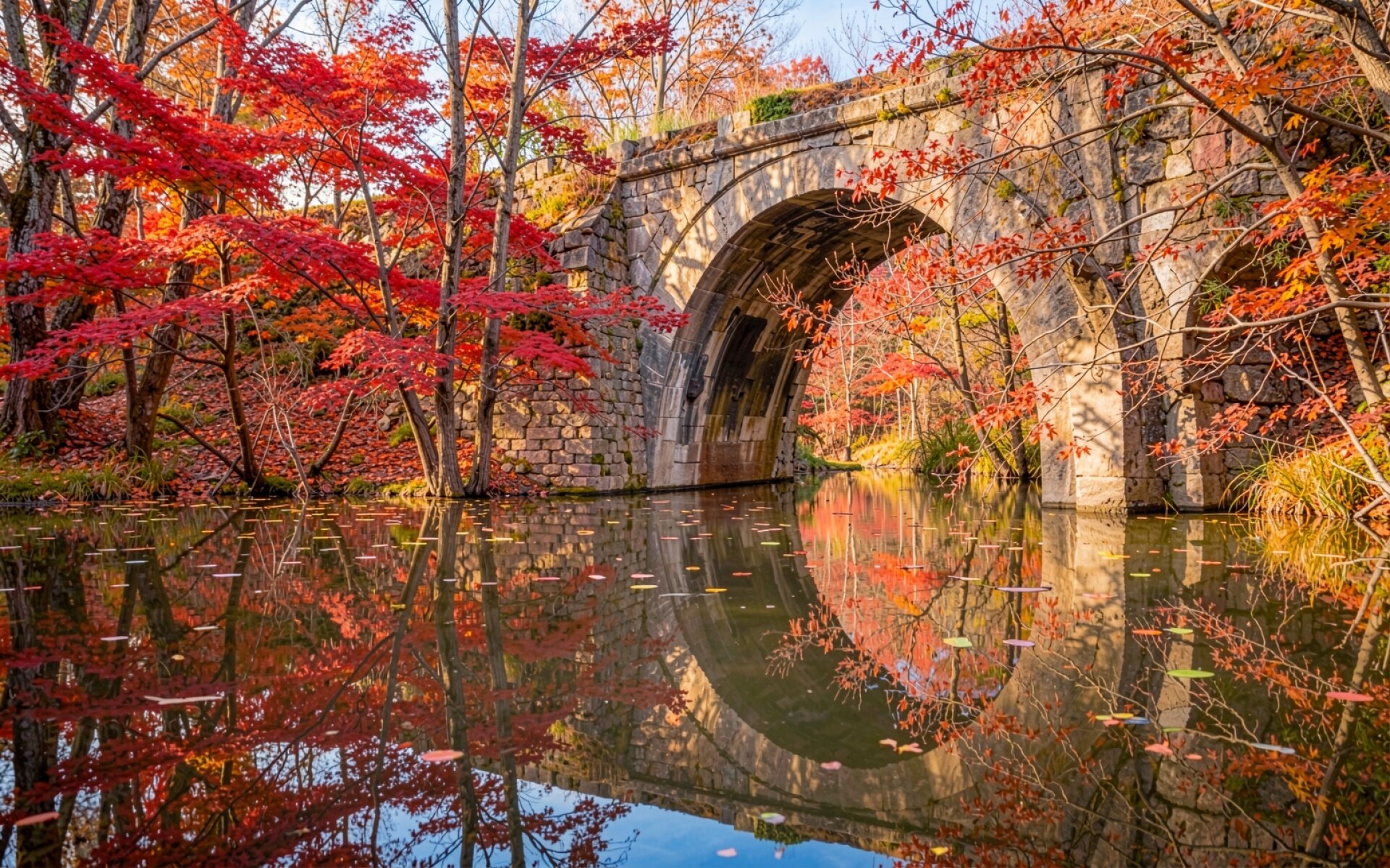 Каменный мост в осеннем лесу с красными кленами