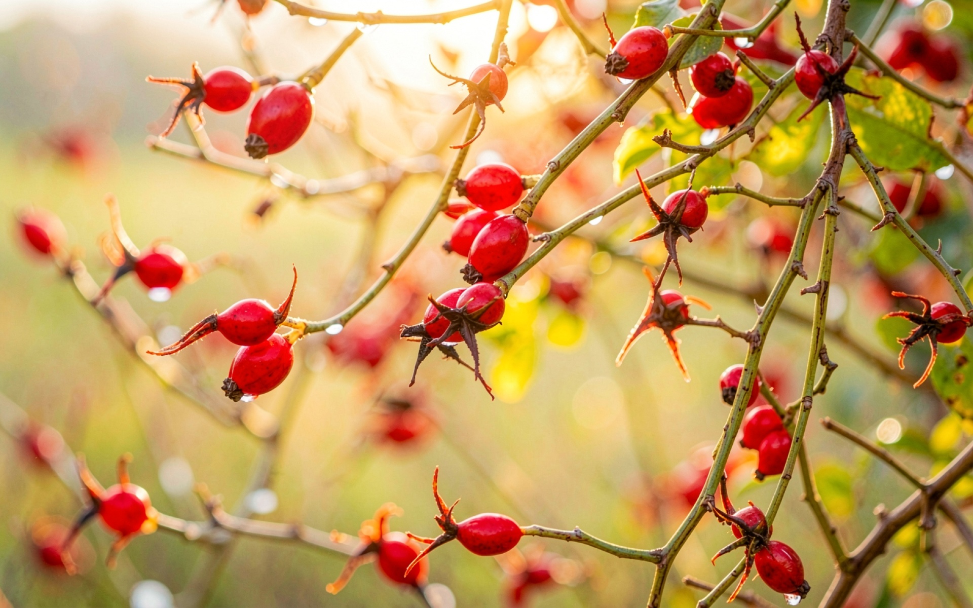 Красные плоды шиповника в осеннем солнечном свете