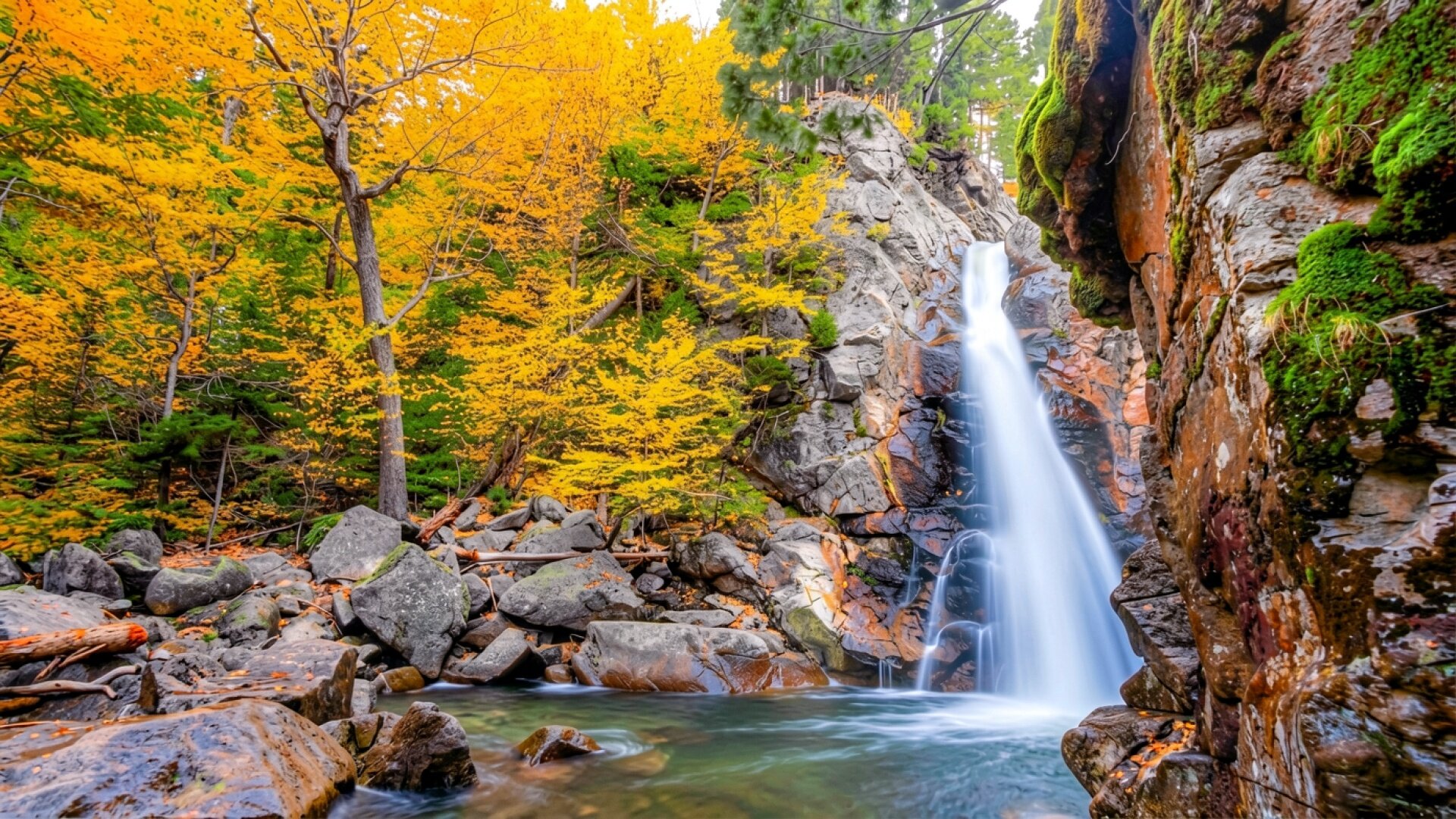 Осенний водопад в лесу с желтыми деревьями