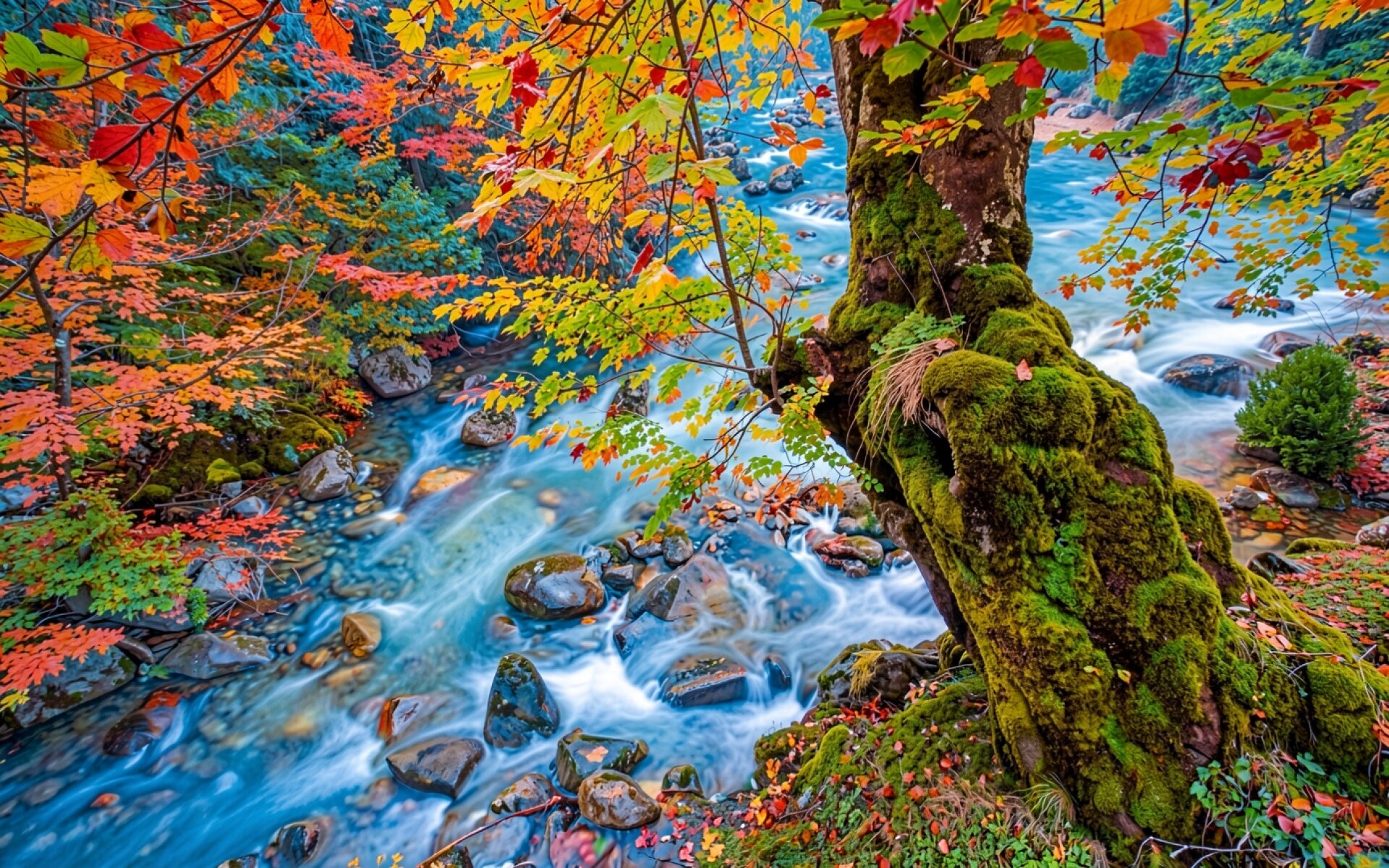 Осенний лес с мшистым деревом у реки