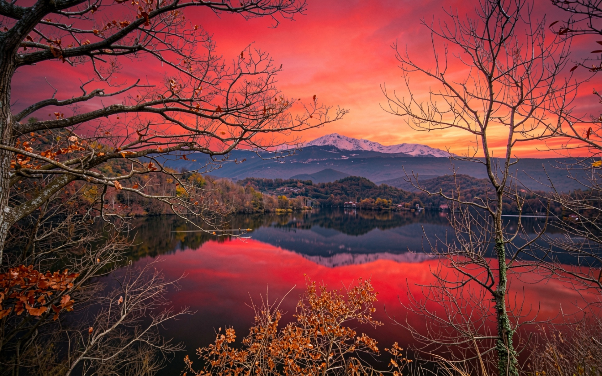 Осенний пейзаж с красным небом и горами