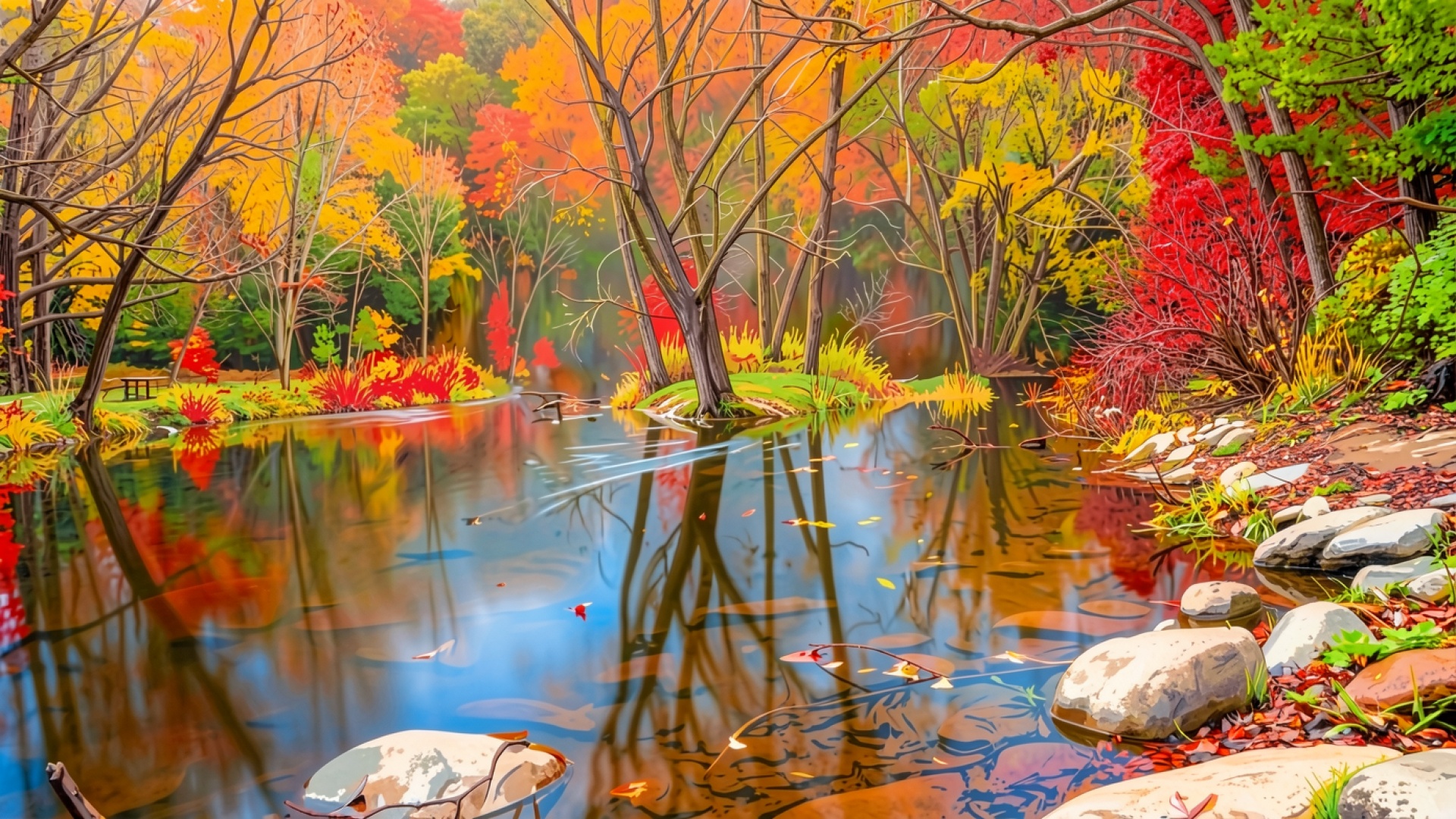 Осенний лес с яркими деревьями у реки
