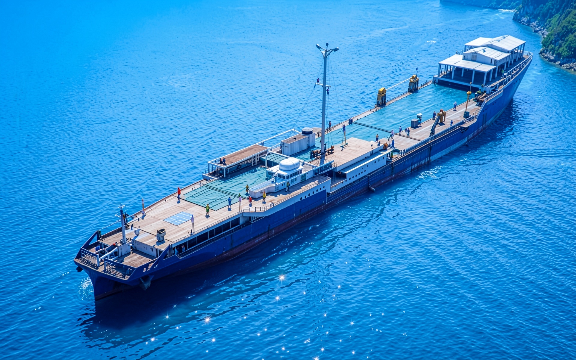 Синий грузовой корабль в открытом море