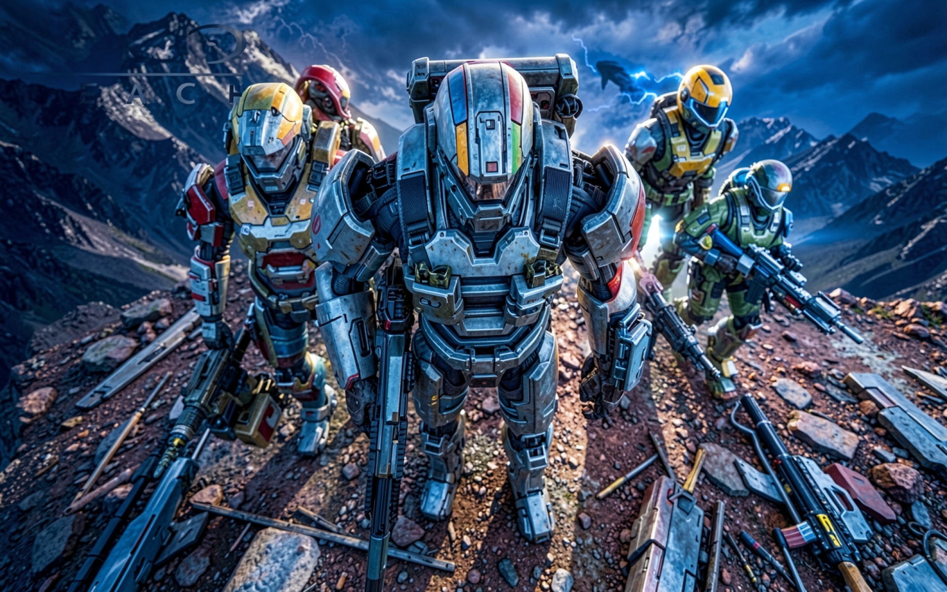 Отряд футуристических солдат в скалистой горной местности