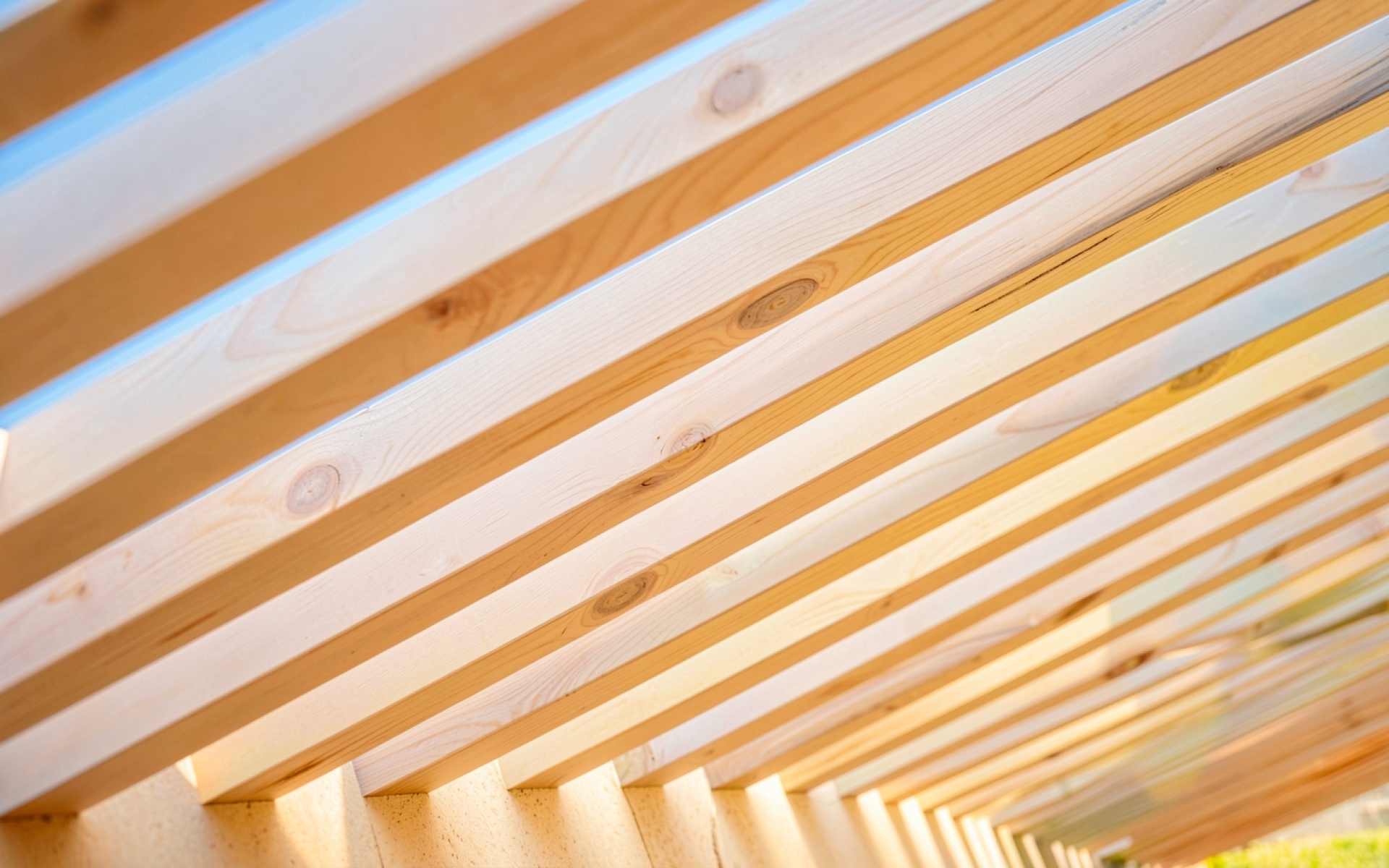 Деревянные балки потолка светлого натурального оттенка