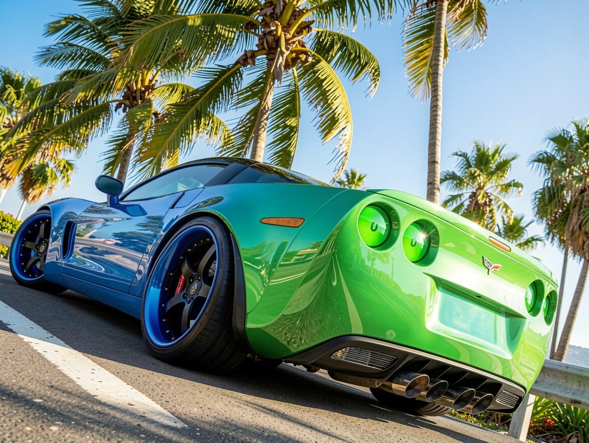 Спортивный автомобиль с градиентом синего зеленого на фоне пальм