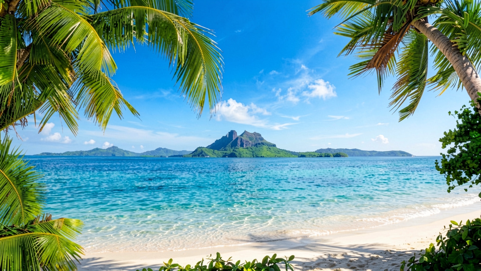 Тропический пляж с пальмами и островом