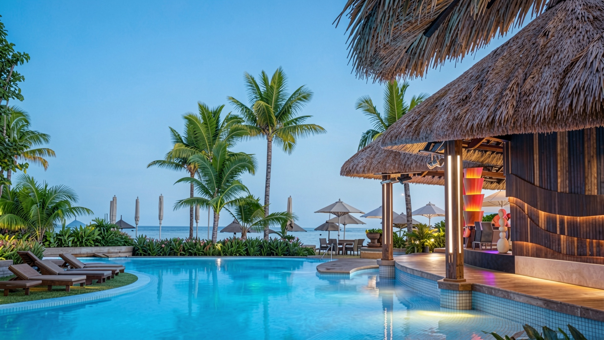 Тропический бассейн с пальмами в сумерках