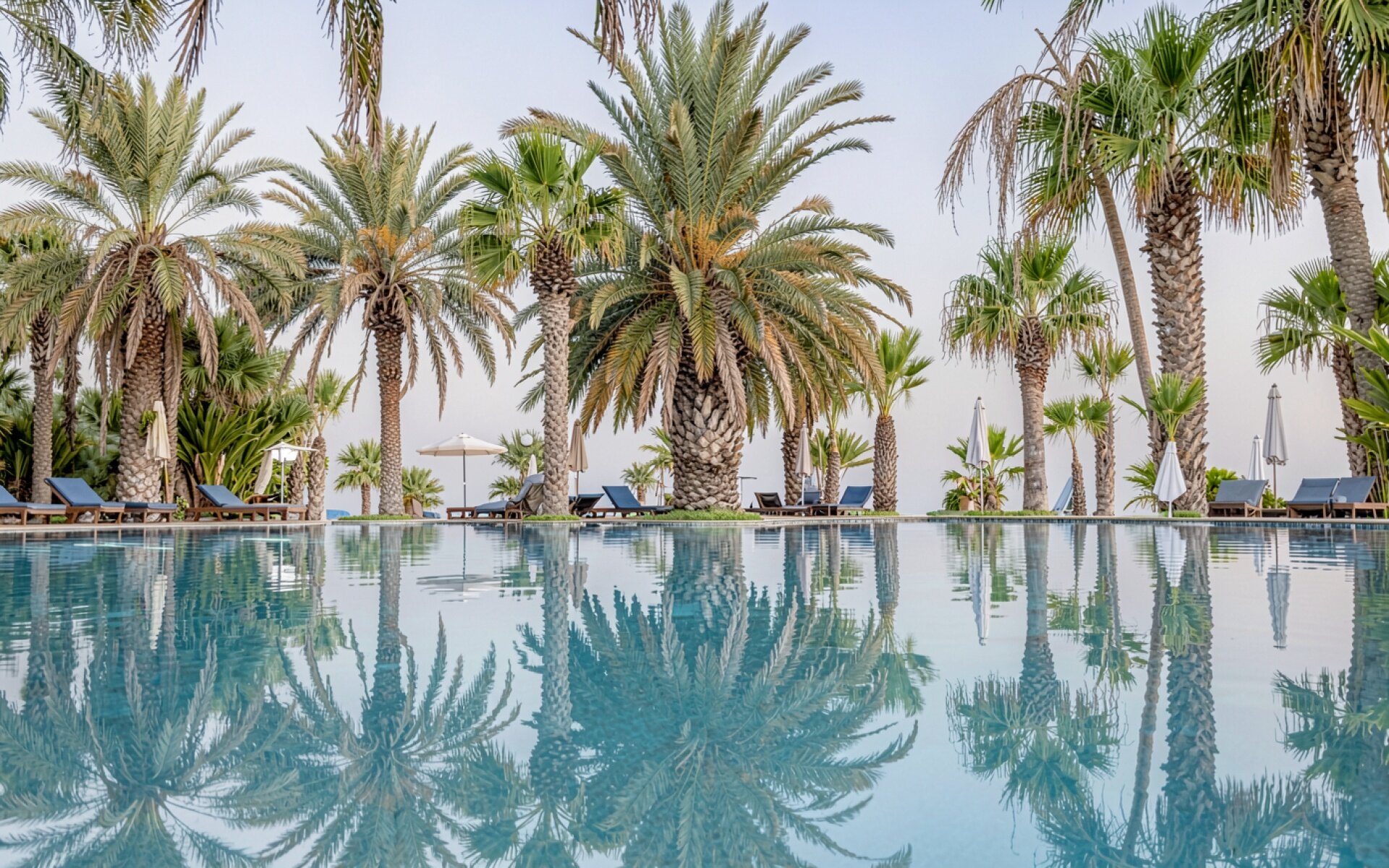 Пальмы у бассейна в солнечный день