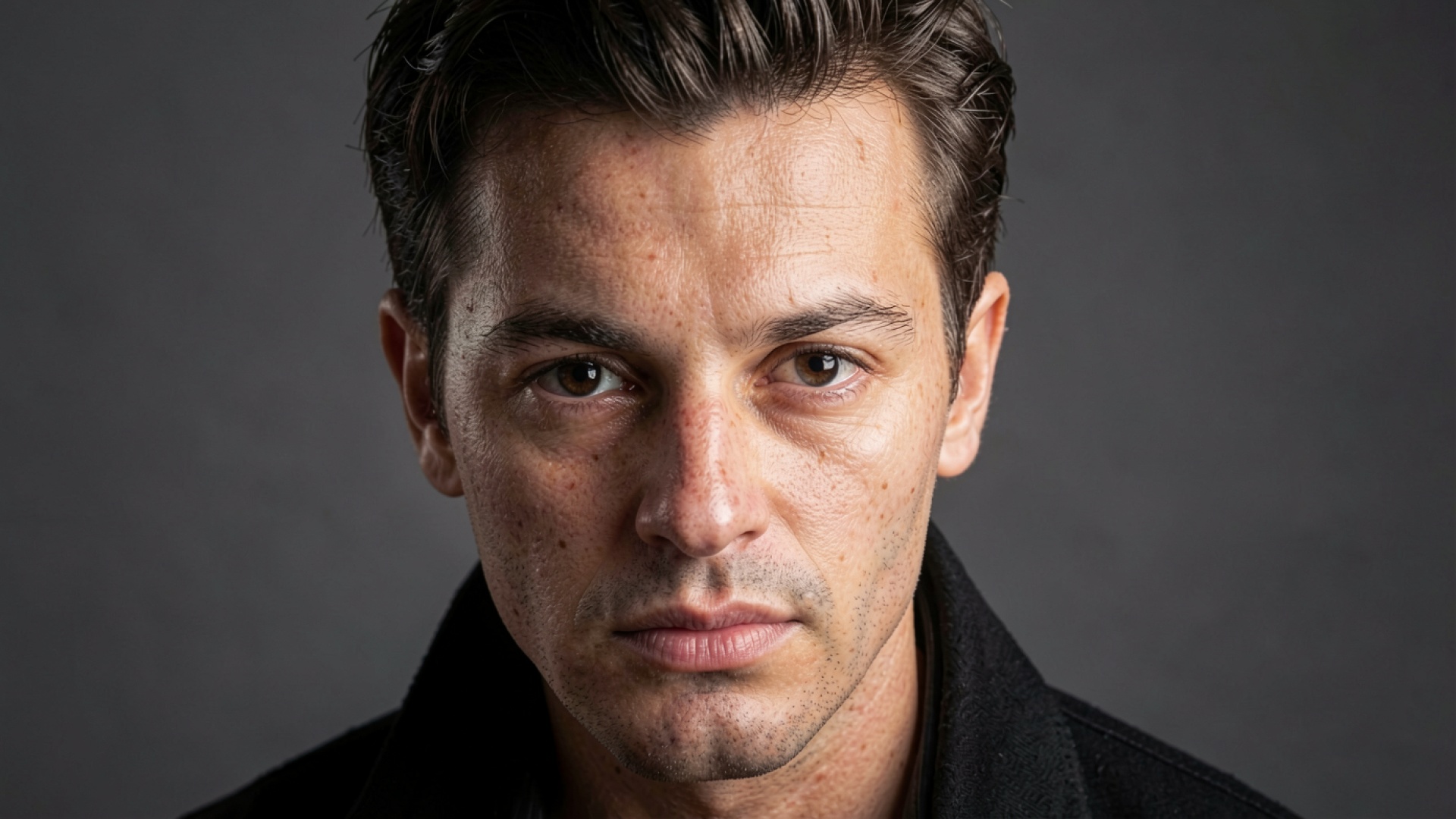 Портрет мужчины в черном пальто серый фон
