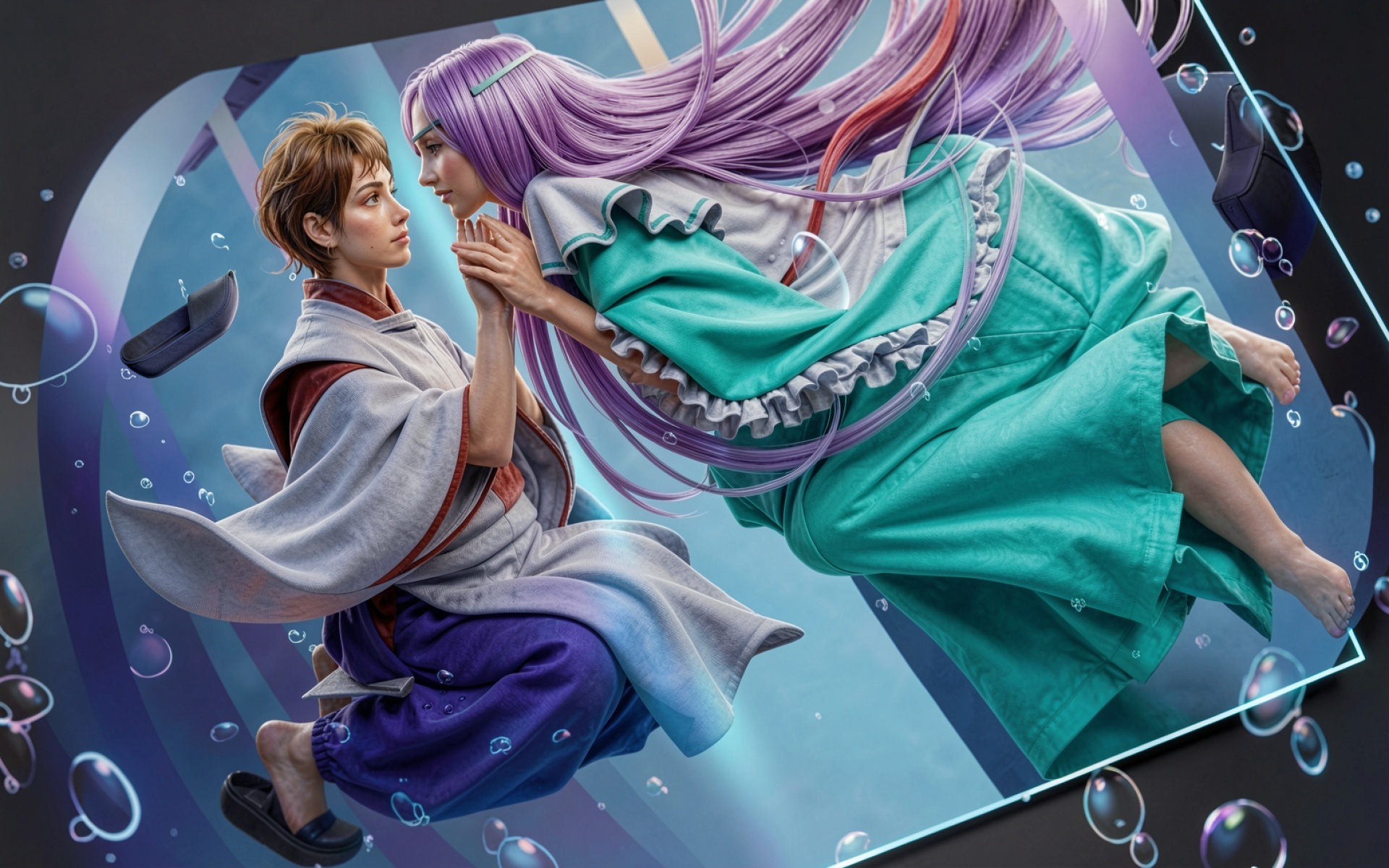 Пара в японских одеждах среди парящих пузырей