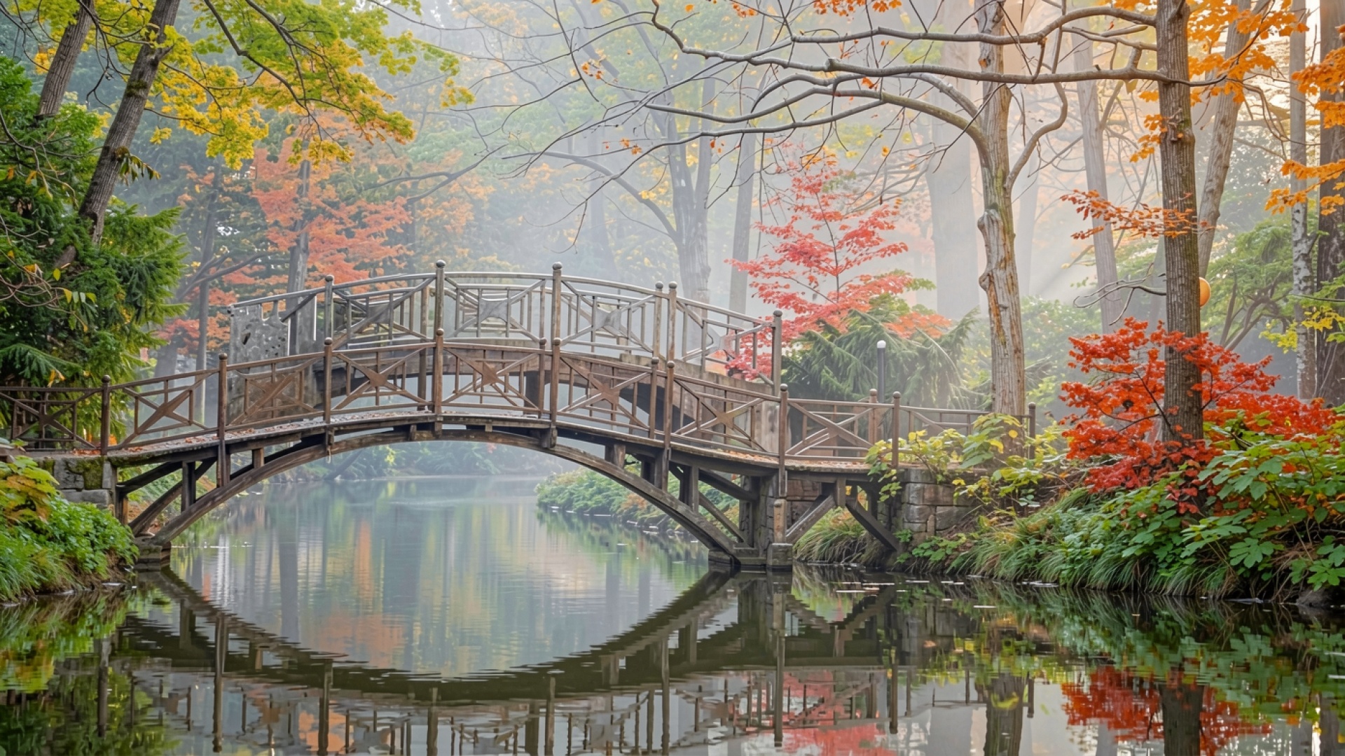 Деревянный мост в туманном осеннем парке