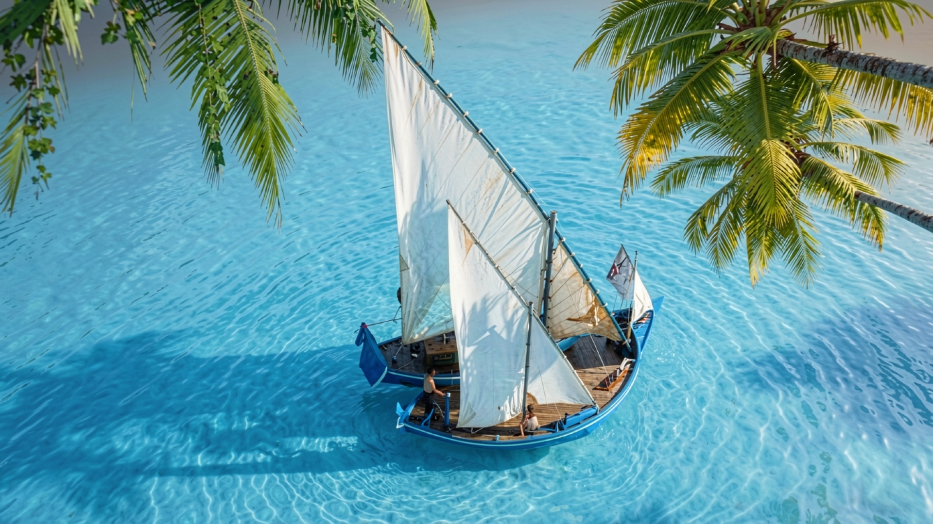Голубая лодка с белыми парусами в тропиках
