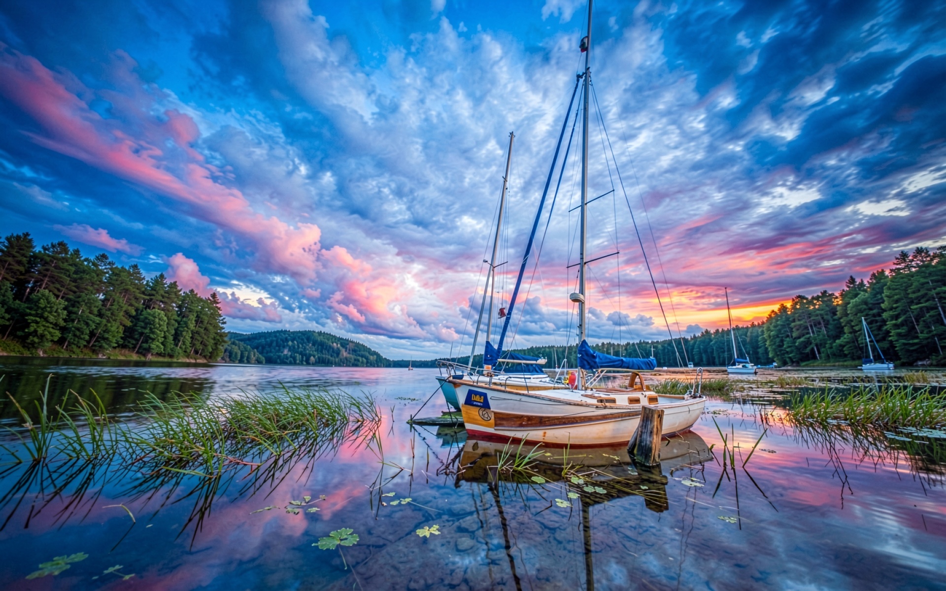 Парусная яхта в озере на закате