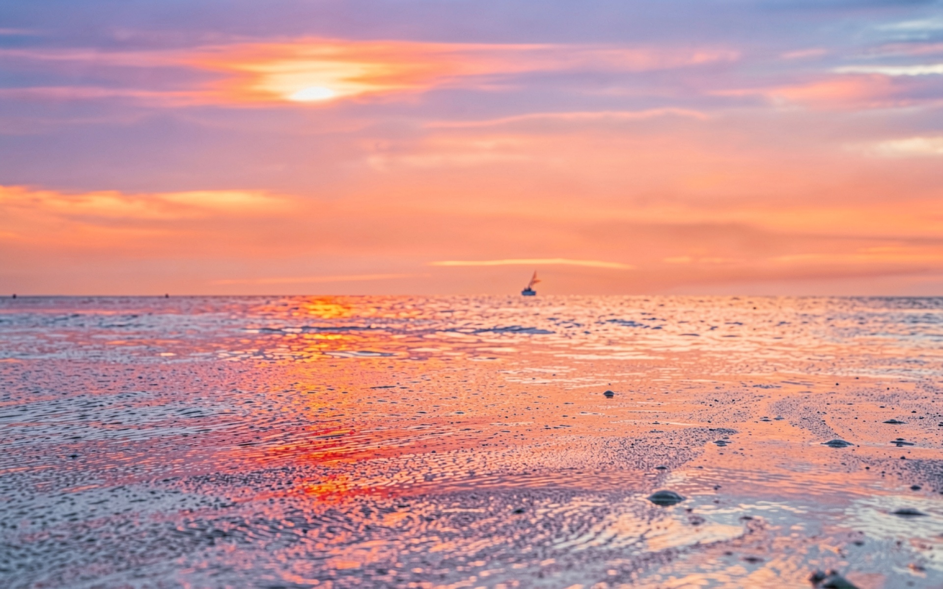 Одинокий парусник в розовом закатном небе