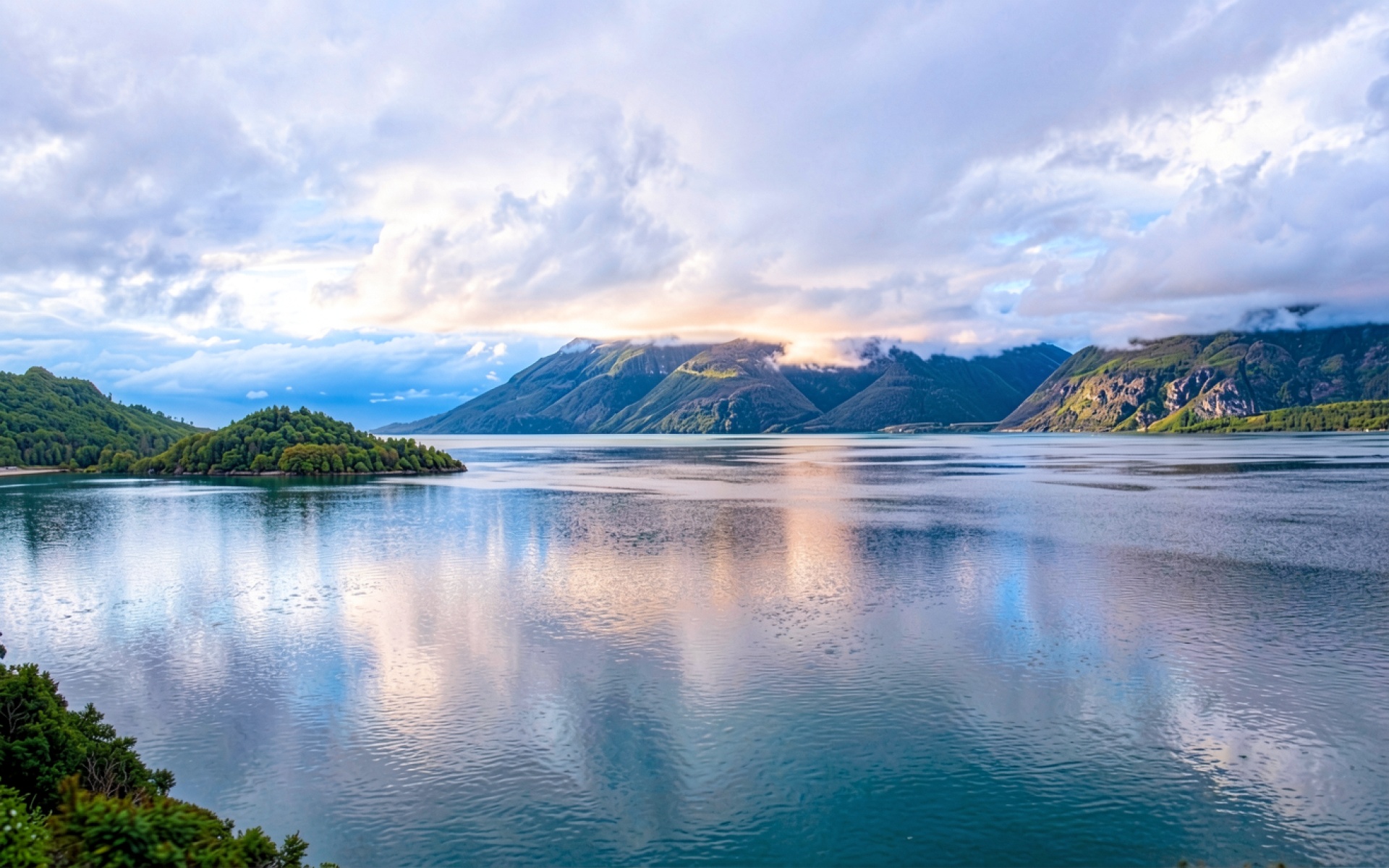 Горный пейзаж с озером в пасмурный день