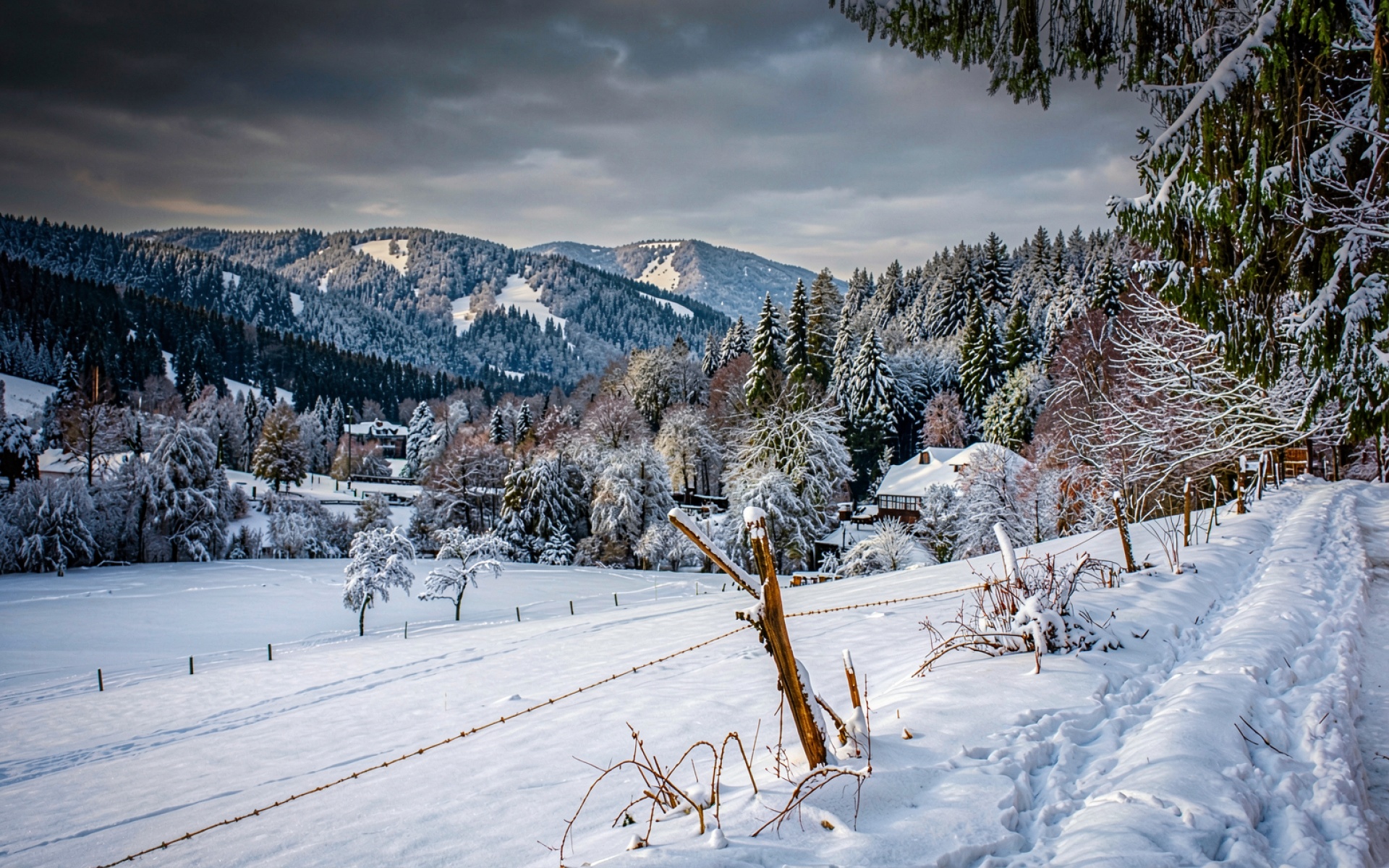 Зимний пейзаж заснеженных гор с деревьями