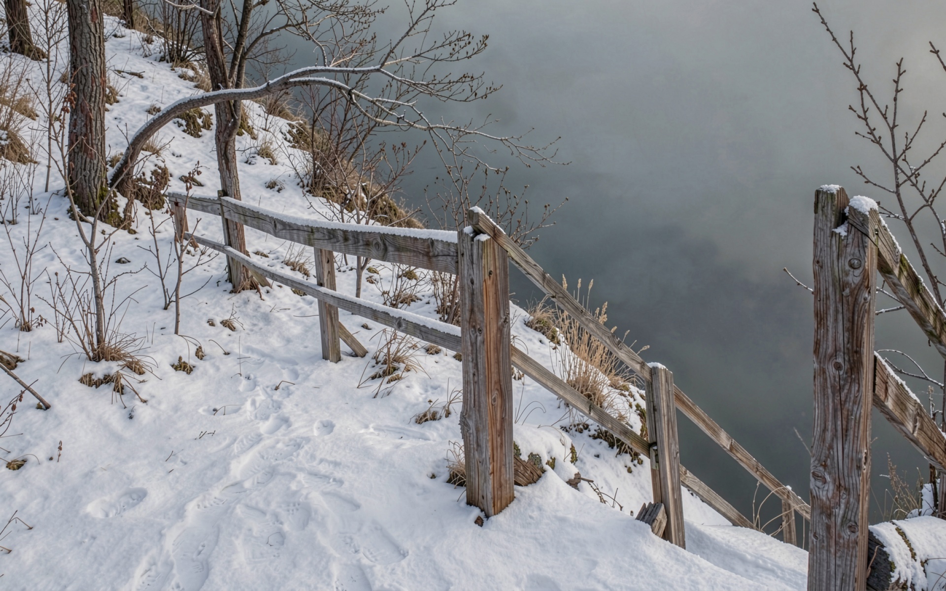 Зимний пейзаж деревянный забор у реки