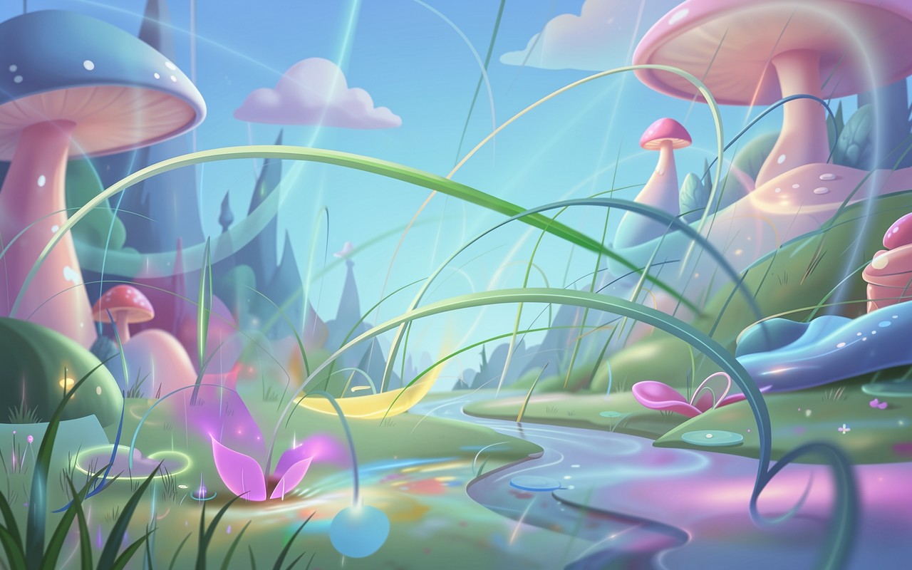 Фантастический пейзаж с гигантскими грибами в пастельных тонах