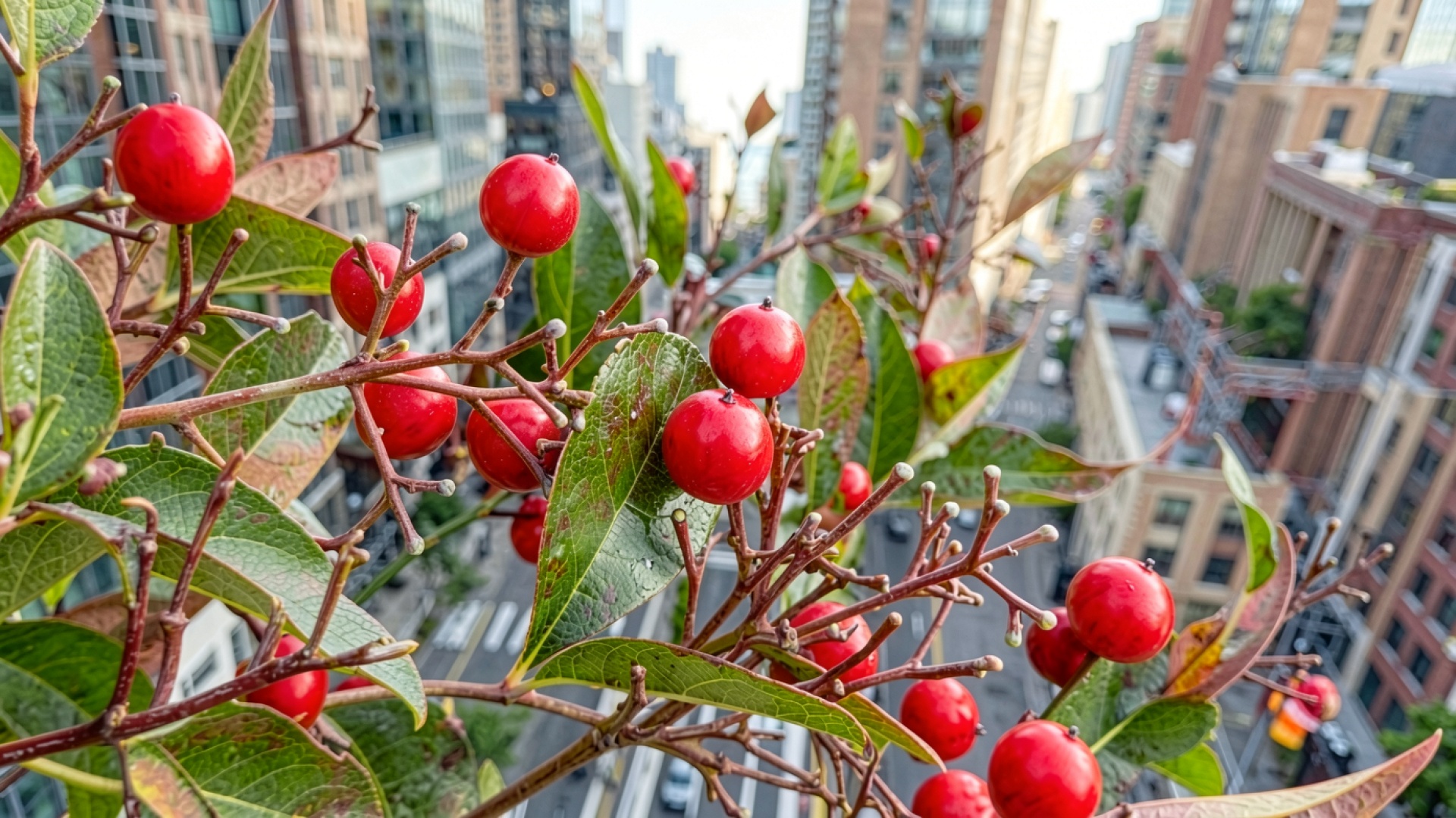 Красные ягоды на ветке в городском пейзаже