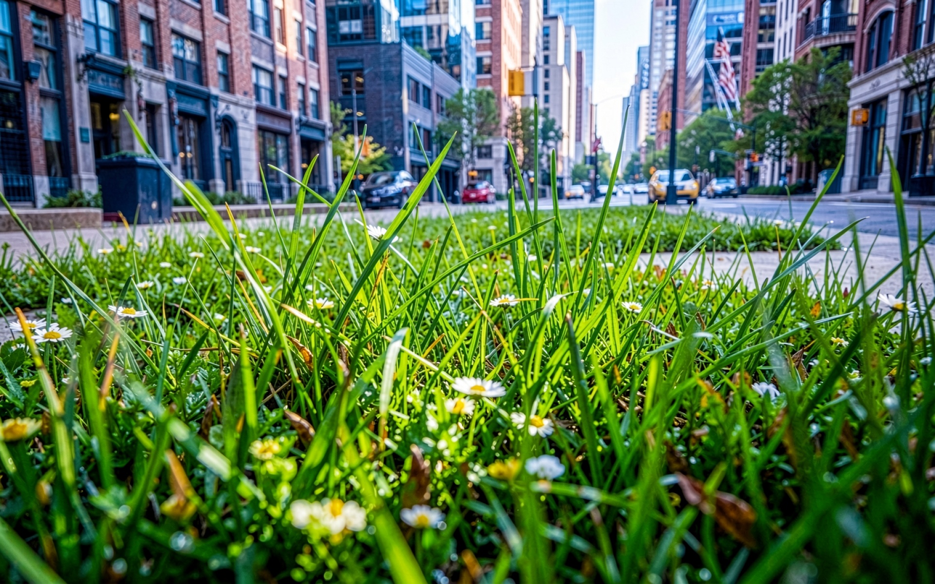 Зеленая трава с ромашками в городском пейзаже