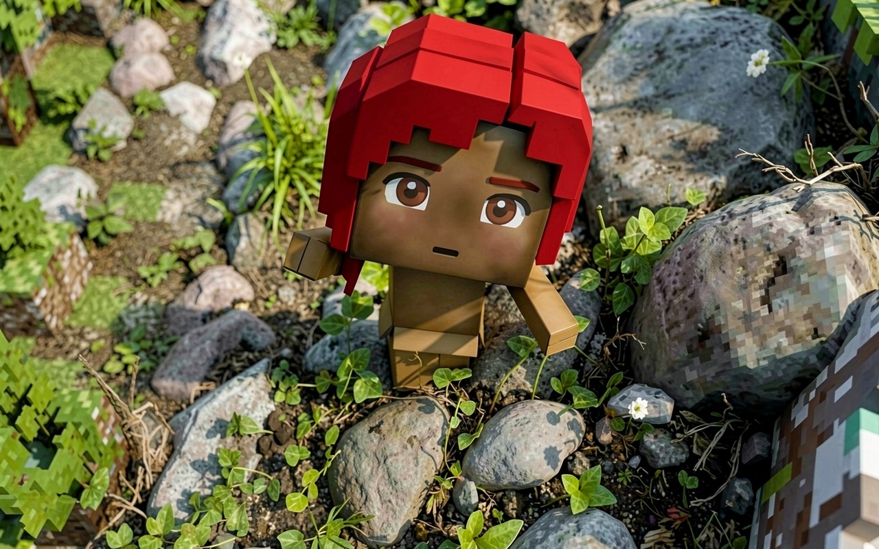 Персонаж с красными волосами в каменистом лесу
