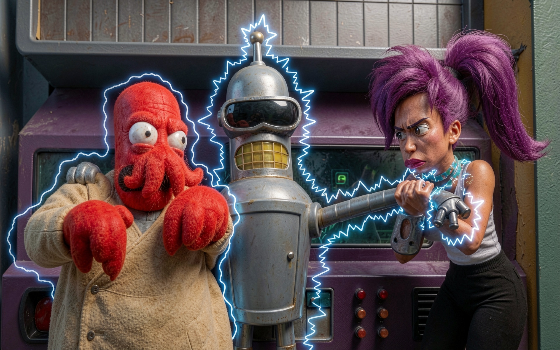 Персонажи Футурамы красная палитра индустриальный фон