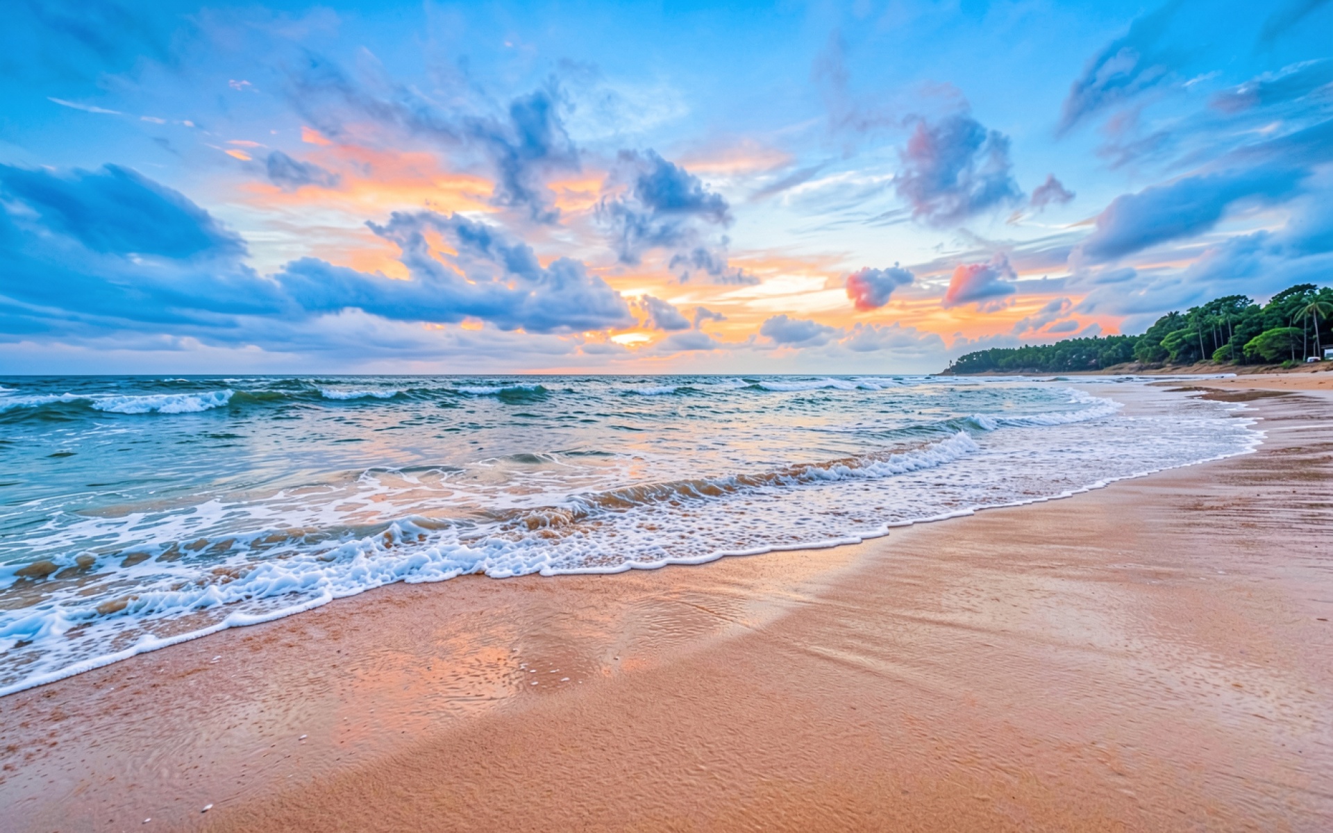 Тропический пляж с белым песком на закате