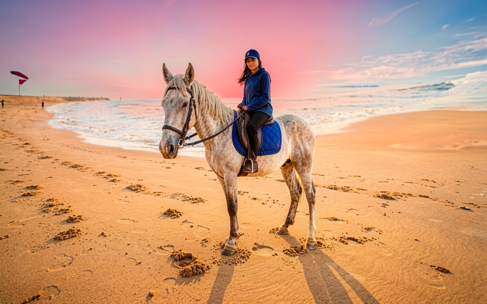 Девушка на белой лошади на песчаном пляже