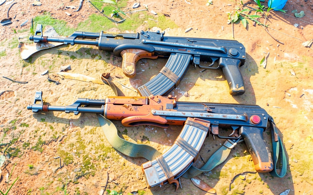 Два автомата Калашникова на песчаном грунте