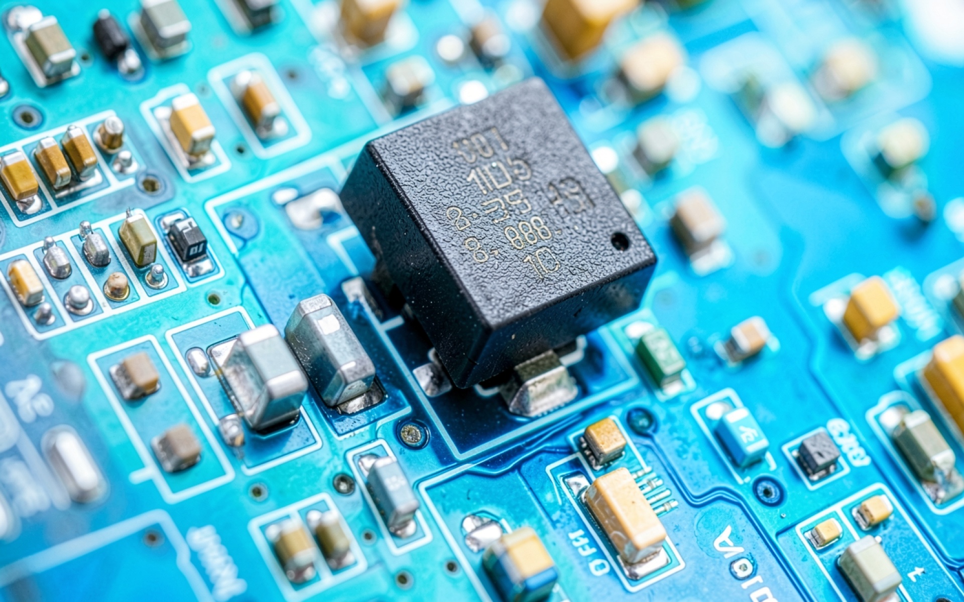 Черный микрочип на синей печатной плате