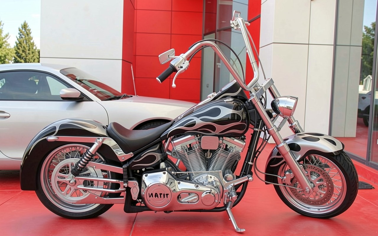Черный кастомный мотоцикл с пламенем на фоне здания