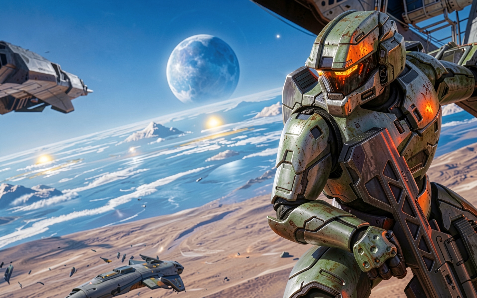 Солдат в зеленой броне на пустынной планете
