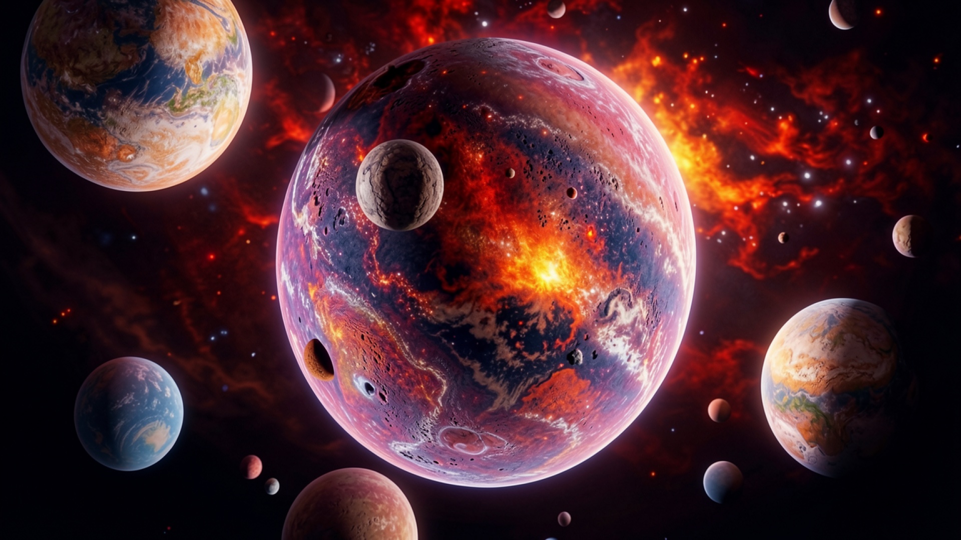 Планеты в красной туманности космического пространства