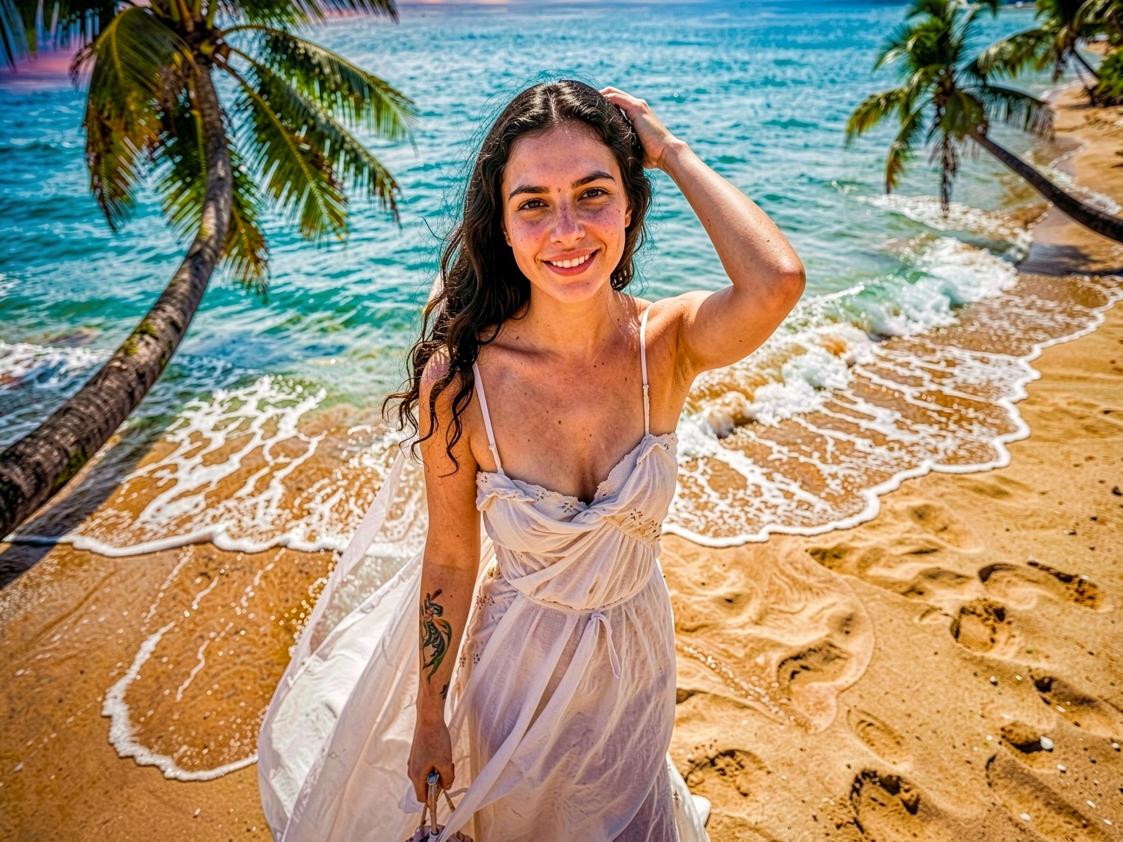 Девушка в белом платье на тропическом пляже