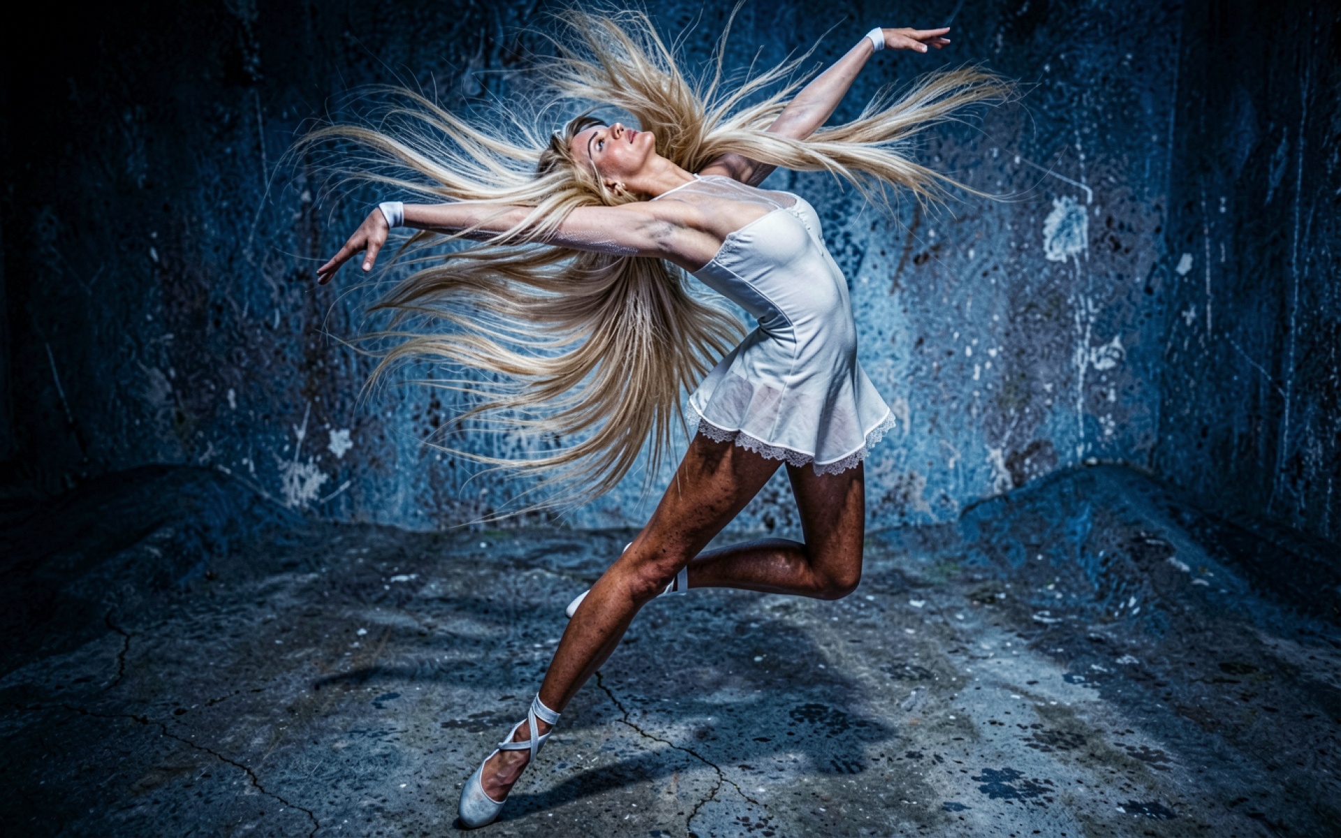 Танцующая девушка в белом платье синий фон