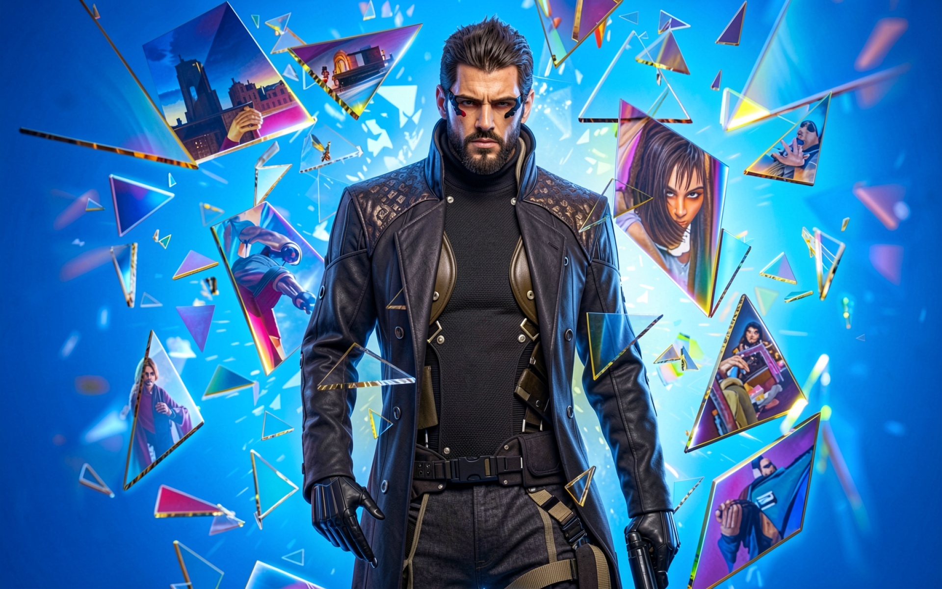 Киберпанк герой в черном плаще синий фон