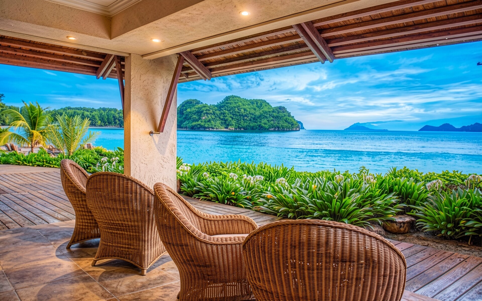Плетеные кресла на террасе у тропического океана