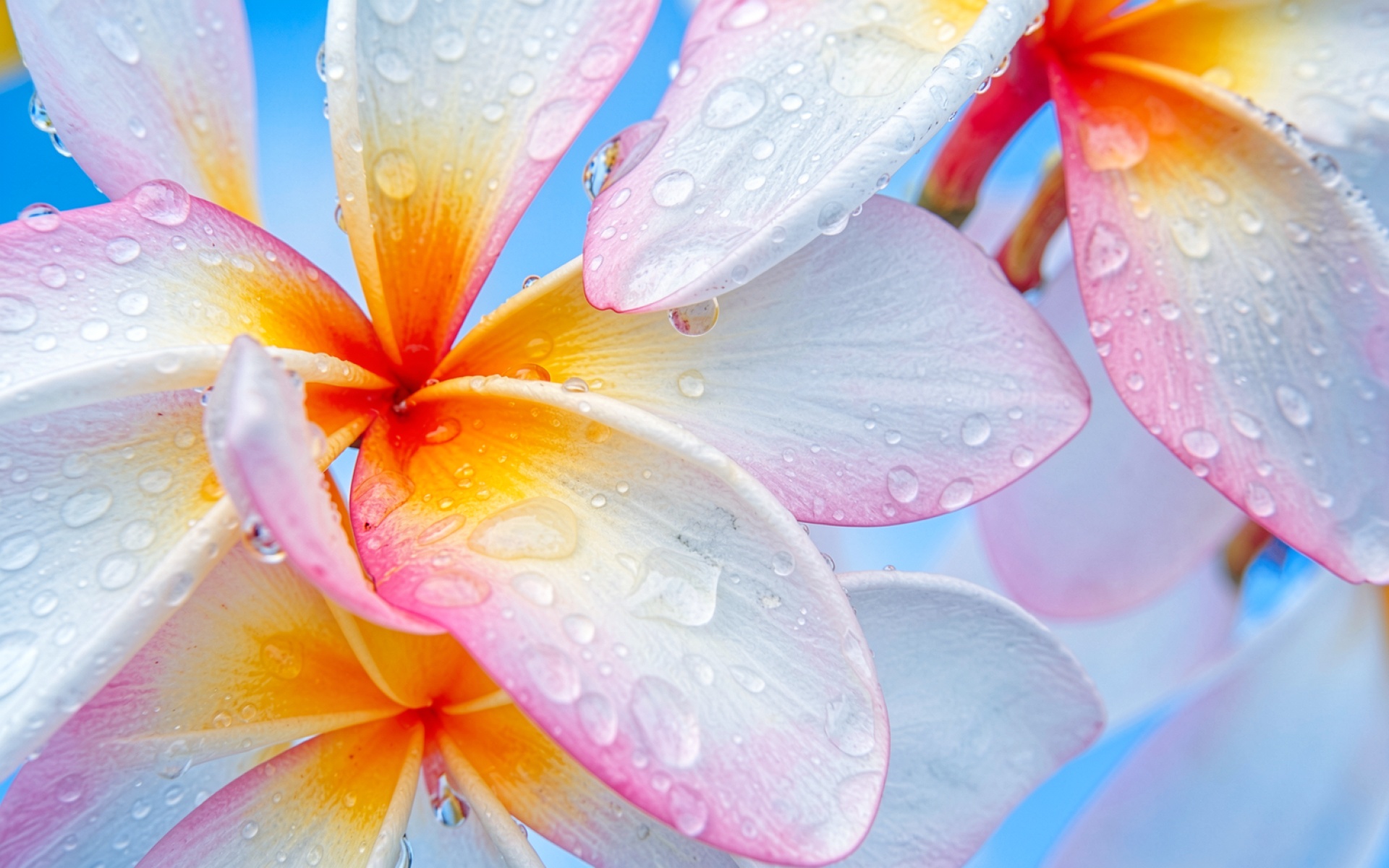 Цветы плюмерии с каплями росы голубой фон