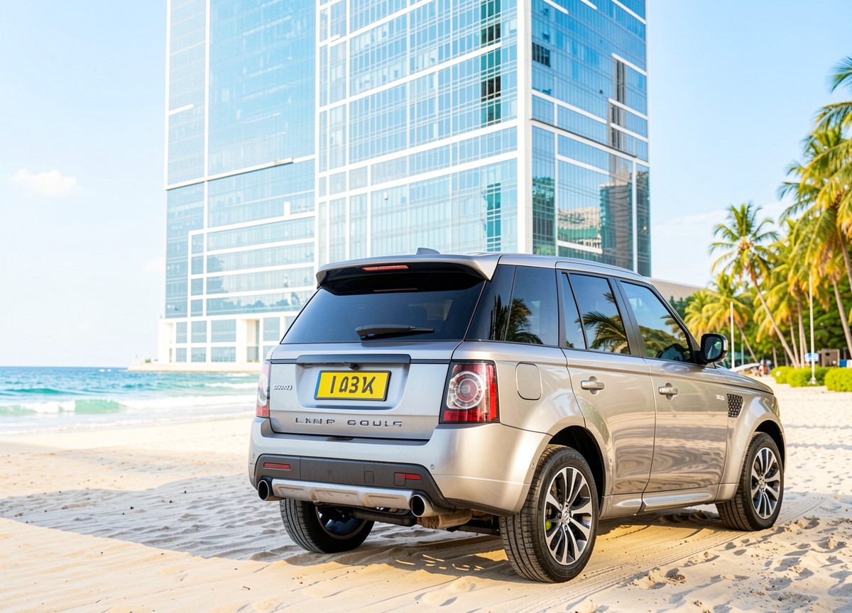 Серебристый Range Rover на песчаном пляже города