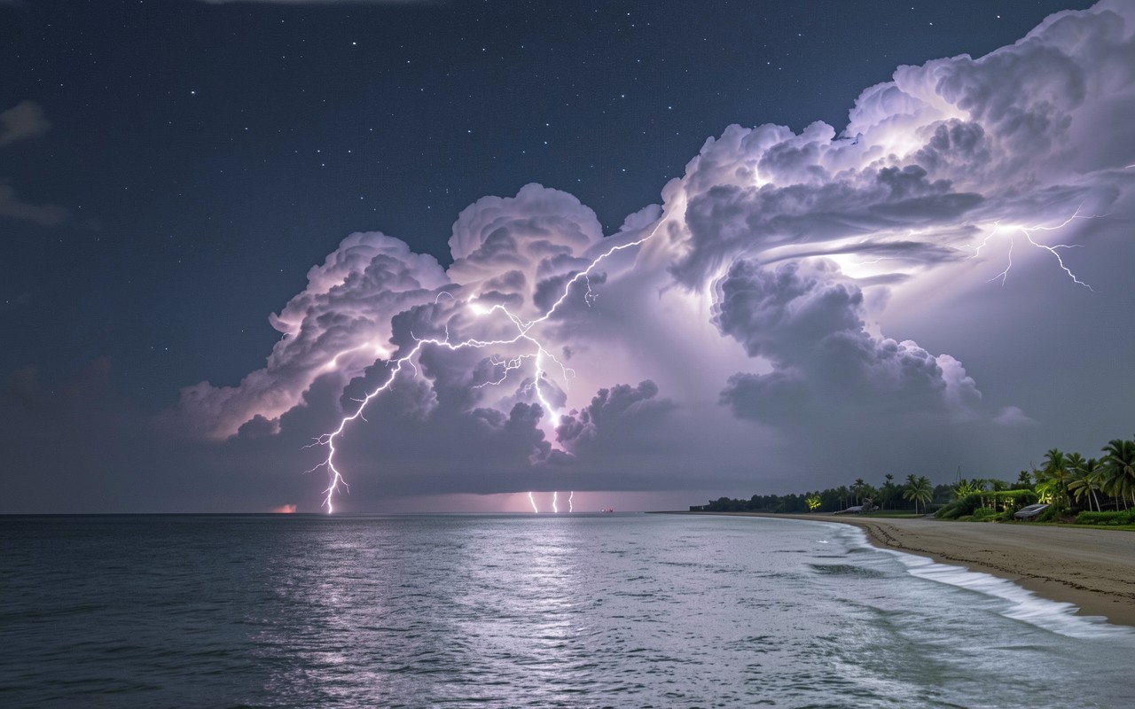Молнии над тропическим пляжем в сумерках