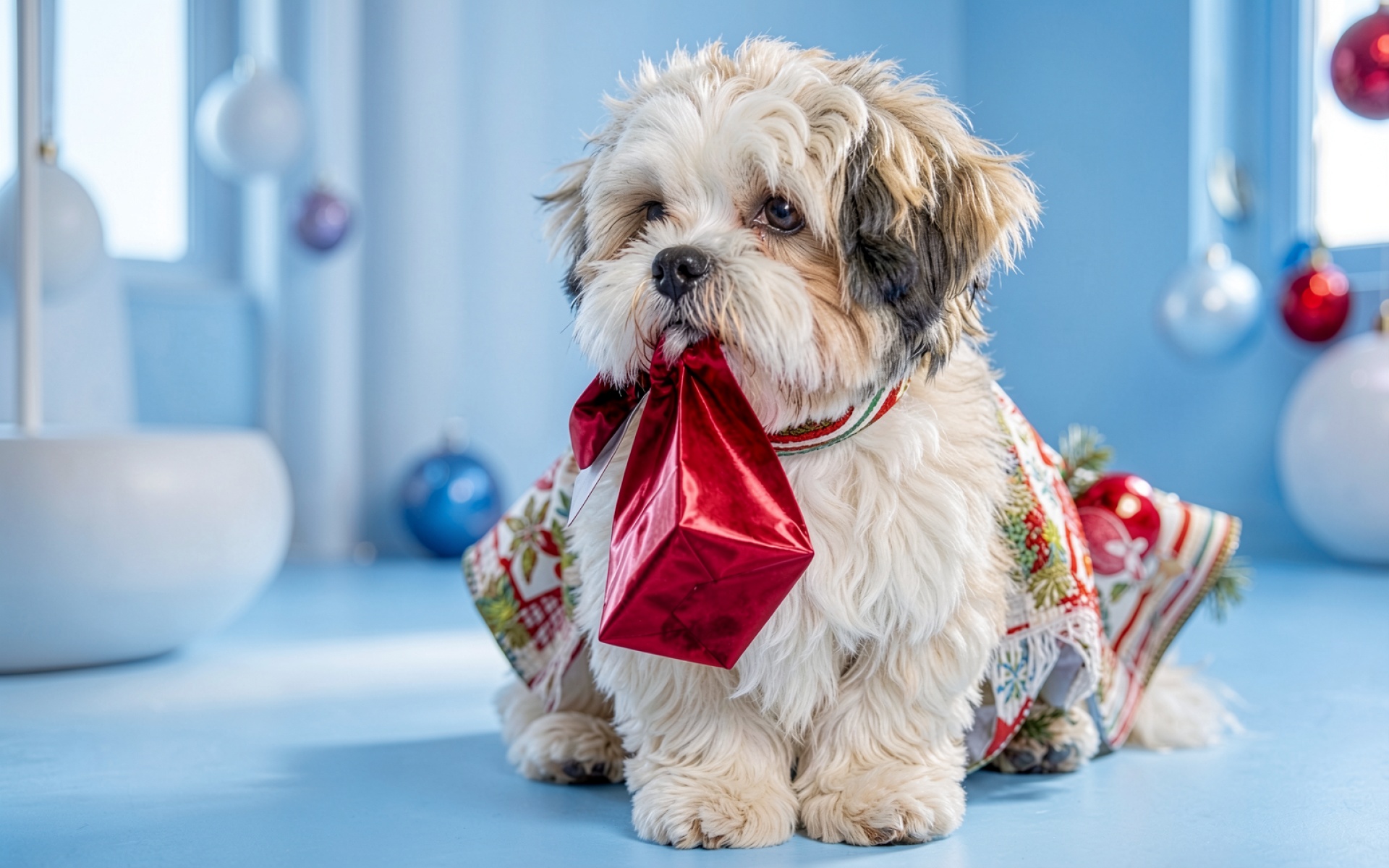 Белый щенок с красным подарком в синей комнате
