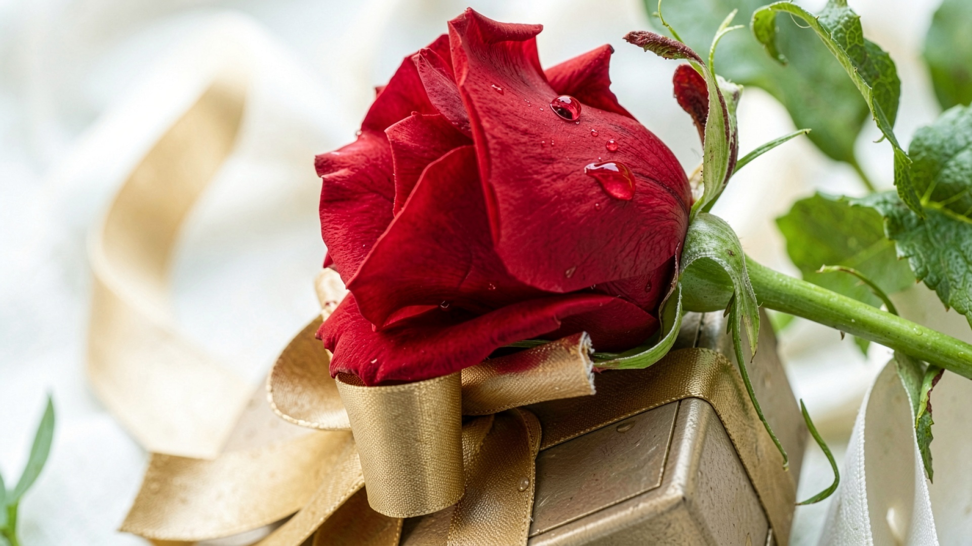 Красная роза на золотой подарочной коробке