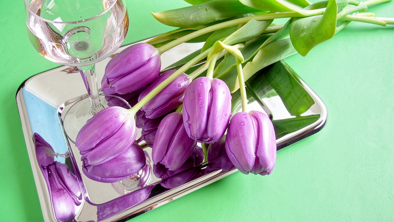 Фиолетовые тюльпаны на серебристом подносе зеленый фон