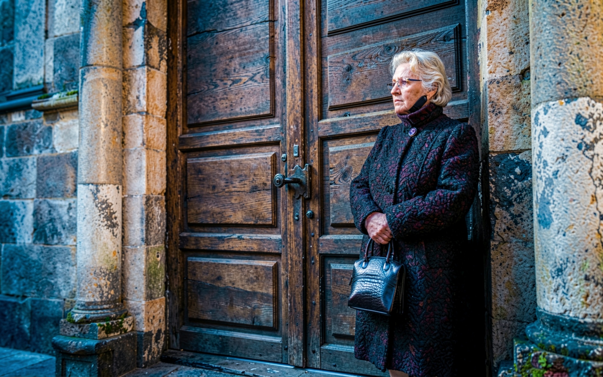 Пожилая женщина в темном пальто у деревянной двери