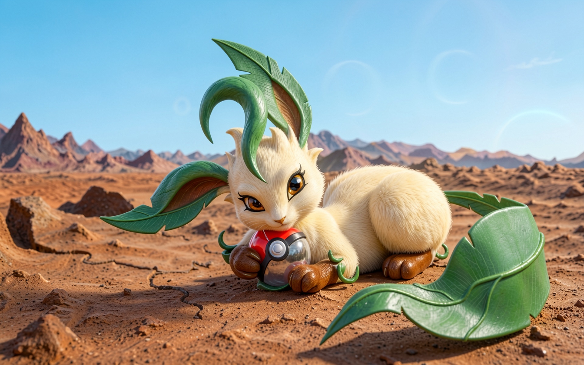 Покемон Лифеон с покеболом в пустыне