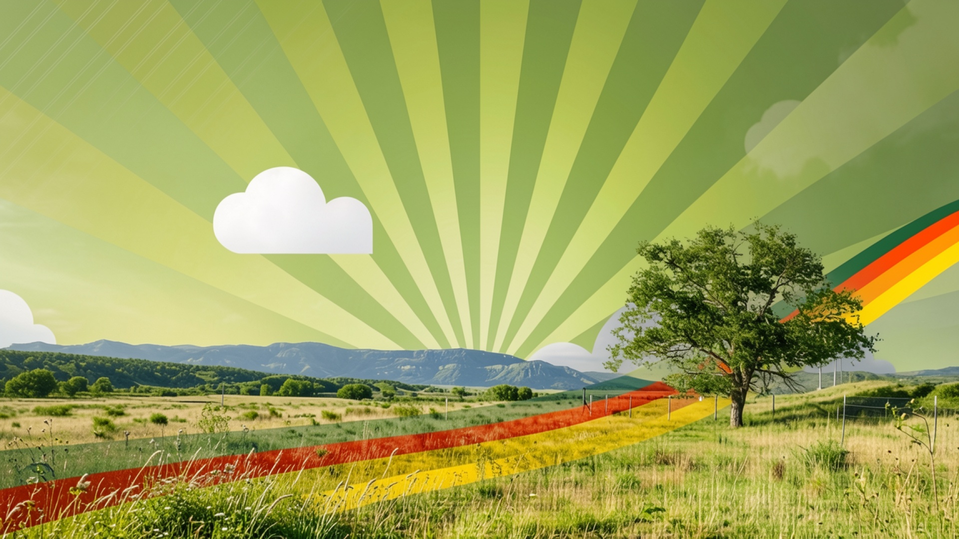 Одинокое дерево в зеленом поле с лучами