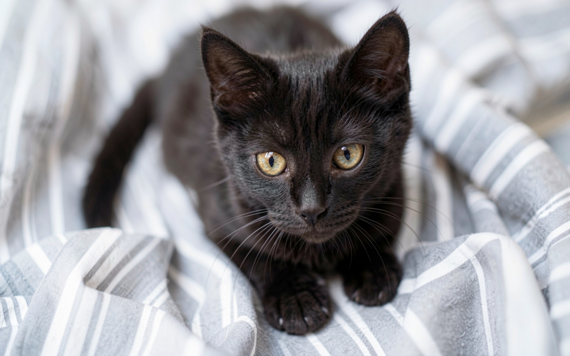 Черный котенок на сером полосатом одеяле