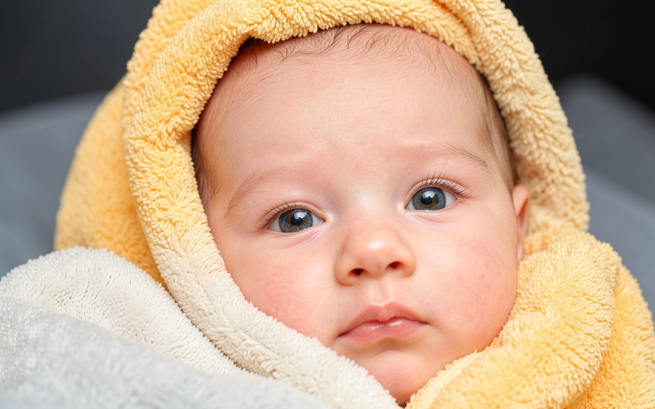 Младенец в желтом махровом полотенце крупный план