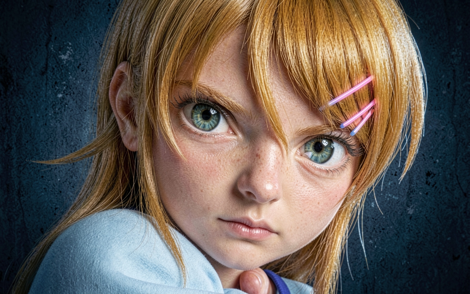 Портрет Аски Лэнгли рыжие волосы неоновые заколки